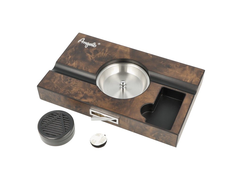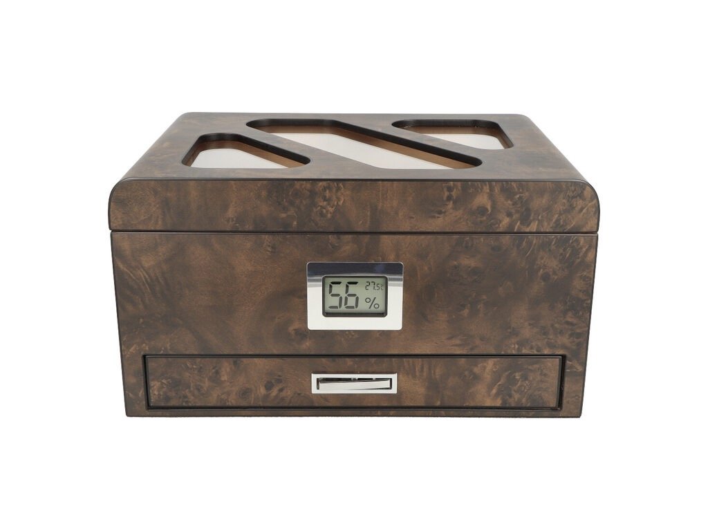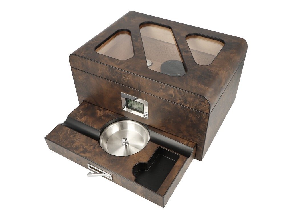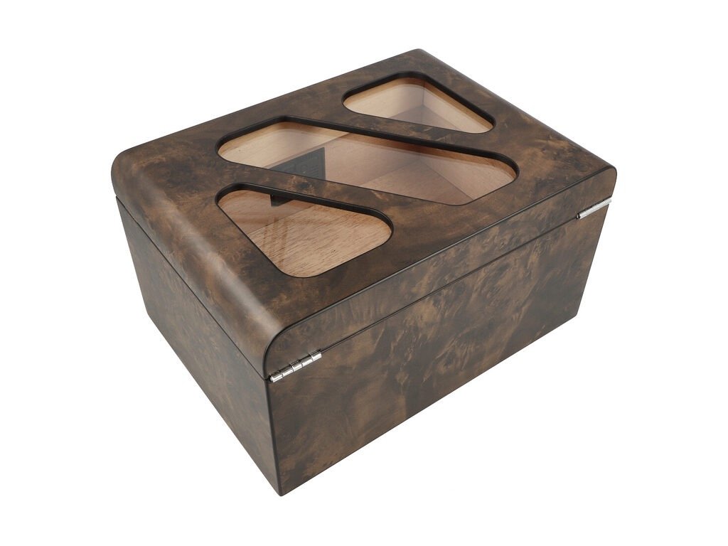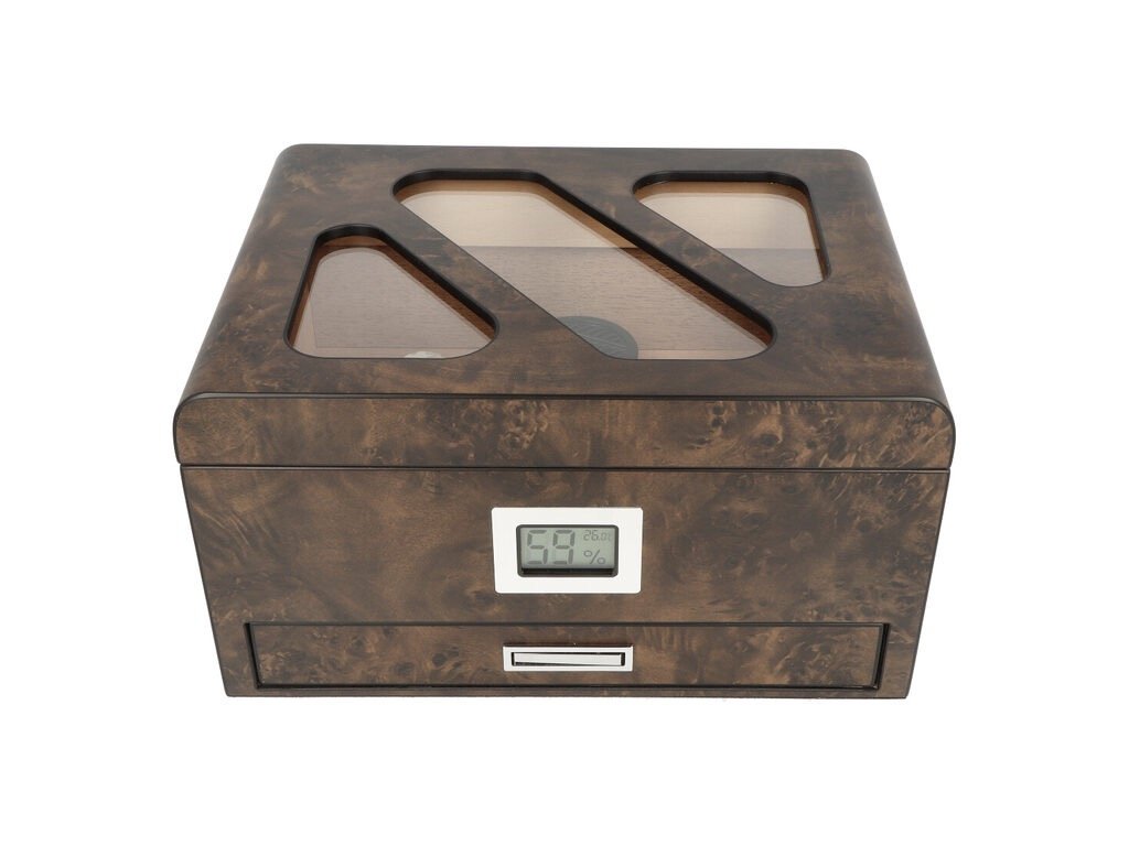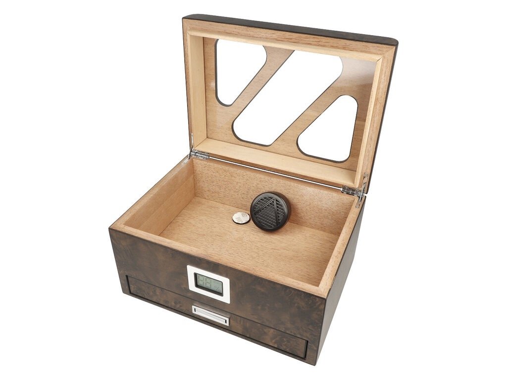 Humidor na doutníky s proskleným víkem, zásuvkou a kapacitou cca na 20 - 30 doutníků (v závislosti na velikosti). Prosklený humidor Window ve tmavě hnědém provedení s méně výraznou kresbou má matný povrch. Skleněná výplň víka Vám umožnuje mít své doutníky stále pod dohledem. Ve spodní části najdeme zásuvku s vyjímatelným kovovým popelníkem, místem pro dva doutníky a prostor pro zapalovač nebo ořezávač. Stolní humidor je vybavený digitálním vlhkoměrem a polymerovým zvlhčovačem. Digitální vlhkoměr uchycený v čelní části humidoru zobrazuje na displeji aktuální vlhkost (%) a teplotu (°C/°F) uvnitř humidoru. K nastavení jednotek teploty se provede přepínačem na zadní straně vlhkoměru. K napájení slouží 1x knoflíková baterie LR1130 1,5V, která je dodávaná v balení. Zvlhčovač je v humidoru uchycen pomocí dvou lepících pásků se suchým zipem. Vnitřek humidoru je vyložený cedrovým dřevem, které prospívá skladování doutníků. Poškrábání povrchu, na kterém je humidor položený, zabraňuje jemná sametová látka, kterou je spodní vnější část humidoru vybavena.