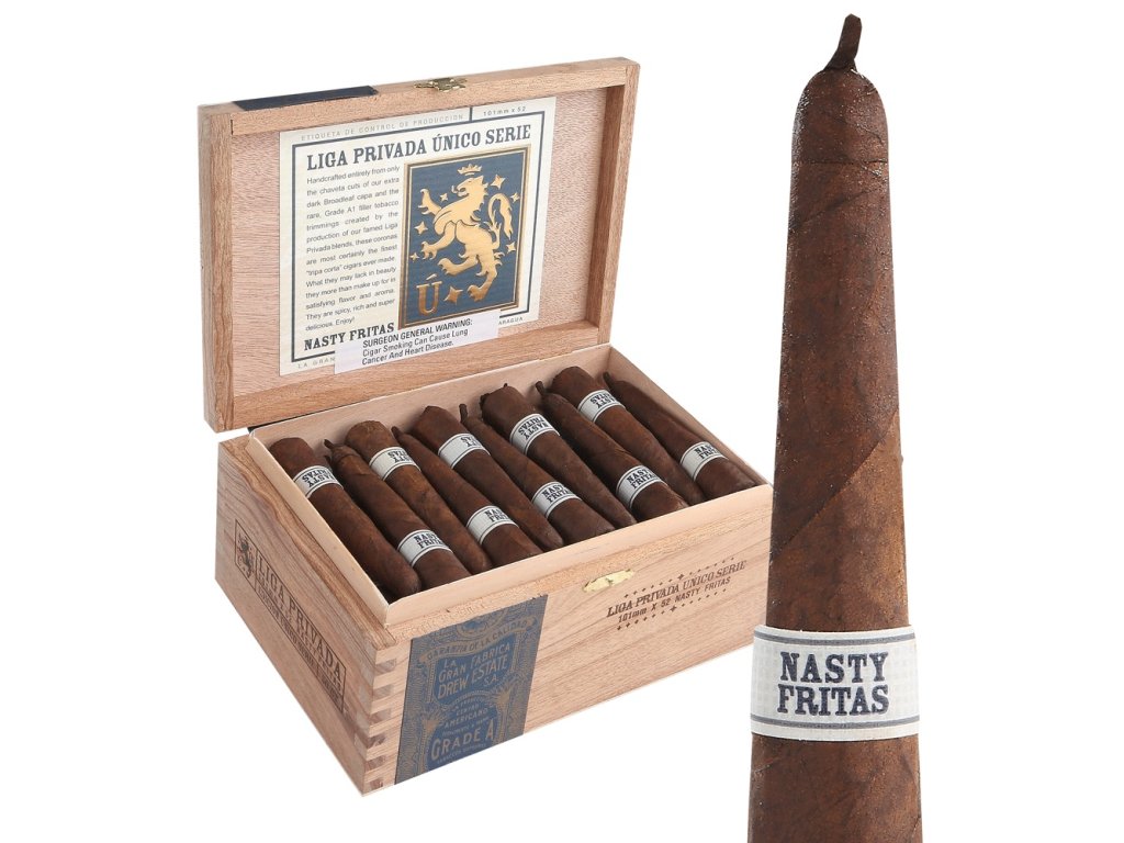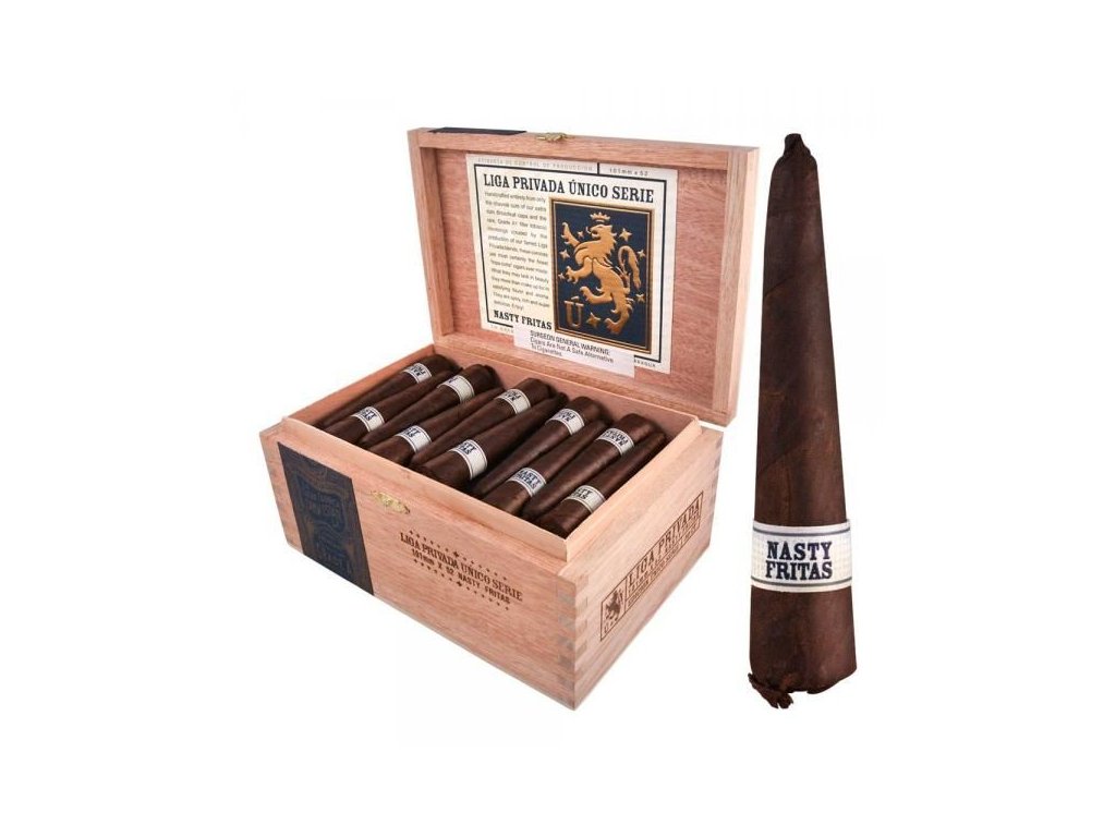 "Liga Privada Unico Nasty Fritas: Umělecky zpracovaný doutník, který nabízí mimořádný zážitek pro milovníky doutníků. S pečlivě vybranými tabáky a mistrovským zpracováním přináší bohatou škálu chutí, od sladkých a kořeněných tónů až po jemné dřevité nuance. Jeho kompaktní velikost skrývá explozi intenzity, což z něj činí dokonalý společník pro momenty, kdy si chcete užít luxusního odpočinku."