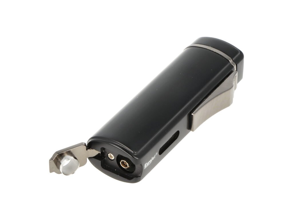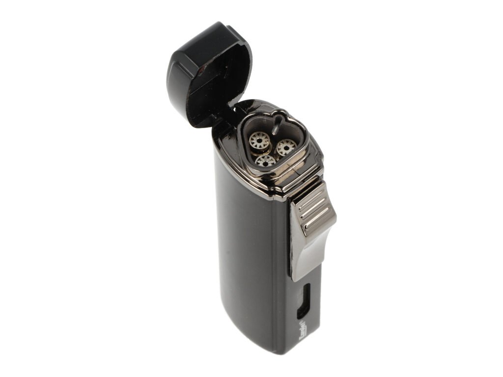 Doutníkový zapalovač Eurojet Namdal 3-Jet s vyštípávačem. Tryskový zapalovač na doutníky je v černém provedení v kombinaci s prvky v gunmetalové úpravě. Na čelní straně kovového zapalovače najdeme okénko, díky kterému můžeme kontrolovat hladinu plynu v zapalovači. Po odklopení horní krytu a stisknutí čelního tlačítka směrem dolů dojde k zapálení třech trysek. Tyto trysky vyvinou dostatečně silný plamen pro zapálení Vašeho oblíbeného doutníku. Doutníkový zapalovač je vybavený integrovaným výklopným vyštípávačem o průměru 8 mm. Ve spodní části najdeme plynový plnící ventil a regulaci intenzity plamene. Zapalovač je dodávaný v dárkové krabičce Eurojet. Rozměry zapalovače 8,2 x 3,1 x 1,9 cm.
