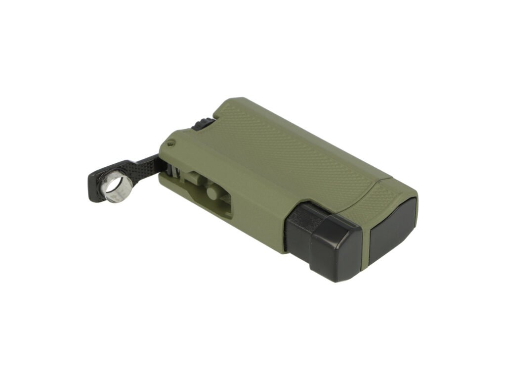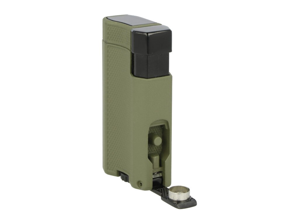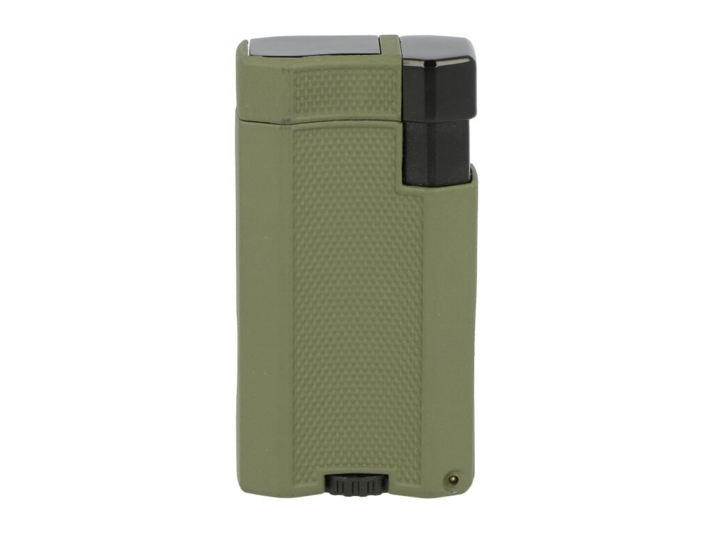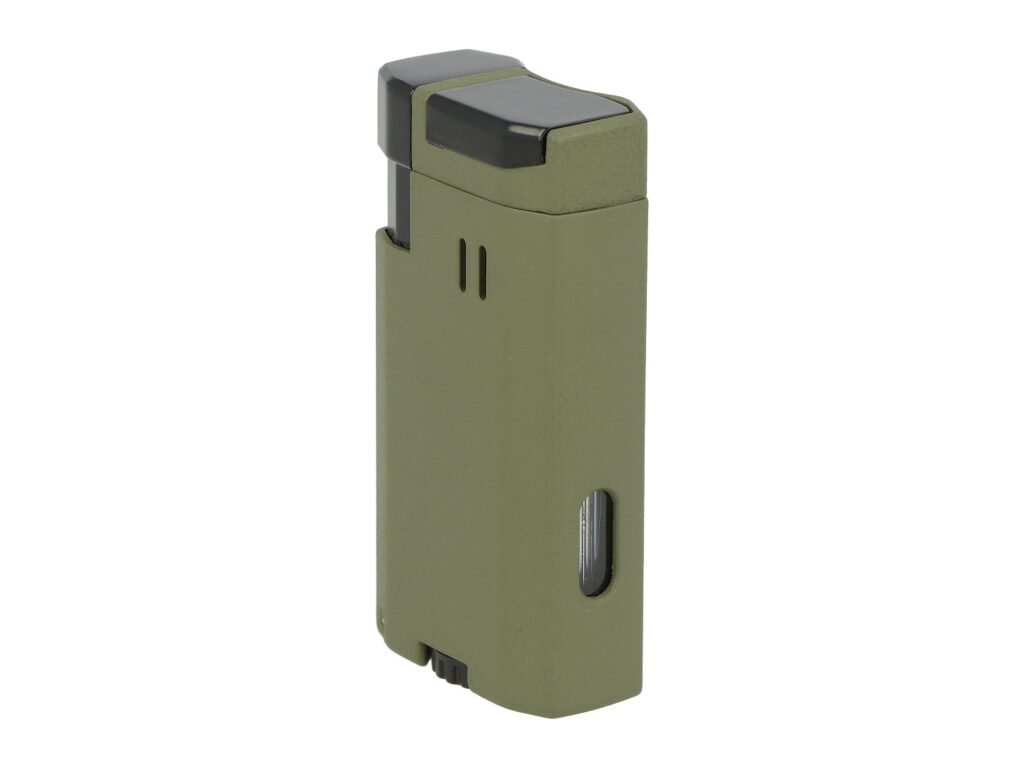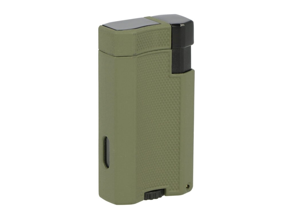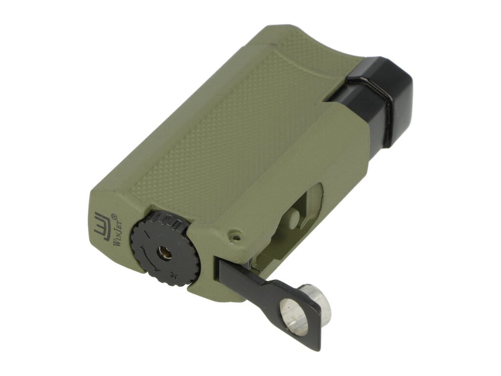 Zapalovač na doutníky Winjet Army s integrovaným vyštípávačem. Kovový tryskový zapalovač je v matném tmavě zeleném provedení. Přední část zdobená hrubší texturou a matný povrch zabraňuje vyklouznutí zapalovače z ruky při zapalování. Po stisknutí bočního tlačítka směrem dolů dojde k otevření horní části a k zapálení dvou trysek. Tyto trysky vyvinou dostatečně silný plamen pro zapálení Vašeho oblíbeného doutníku. Díky okénku na boční straně můžeme kontrolovat hladinu plynu v zapalovači. Na druhém boku zapalovače najdeme výklopný doutníkový vyštípávač. Ve spodní části je umístěný plynový plnící ventil s regulací plamene. Zapalovač je dodávaný v dárkové krabičce.